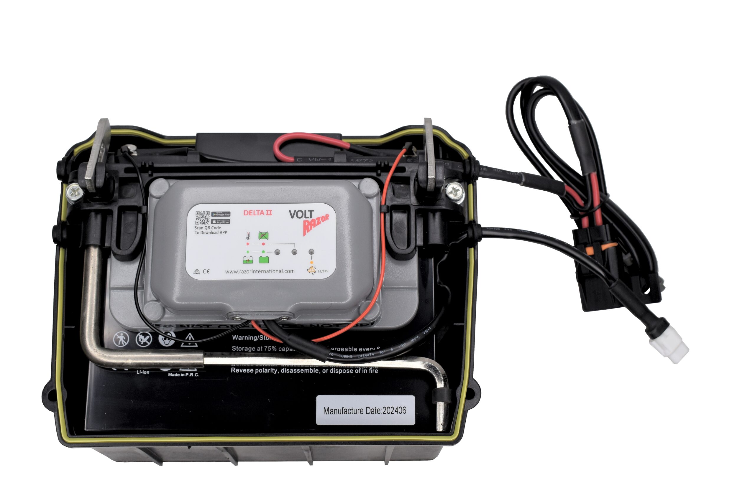 The E-B2U Universal Battery Charger is located inside the Power Kit and has three LED lights.